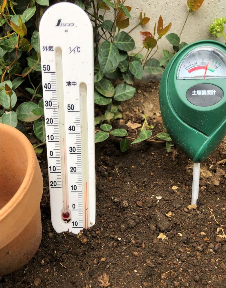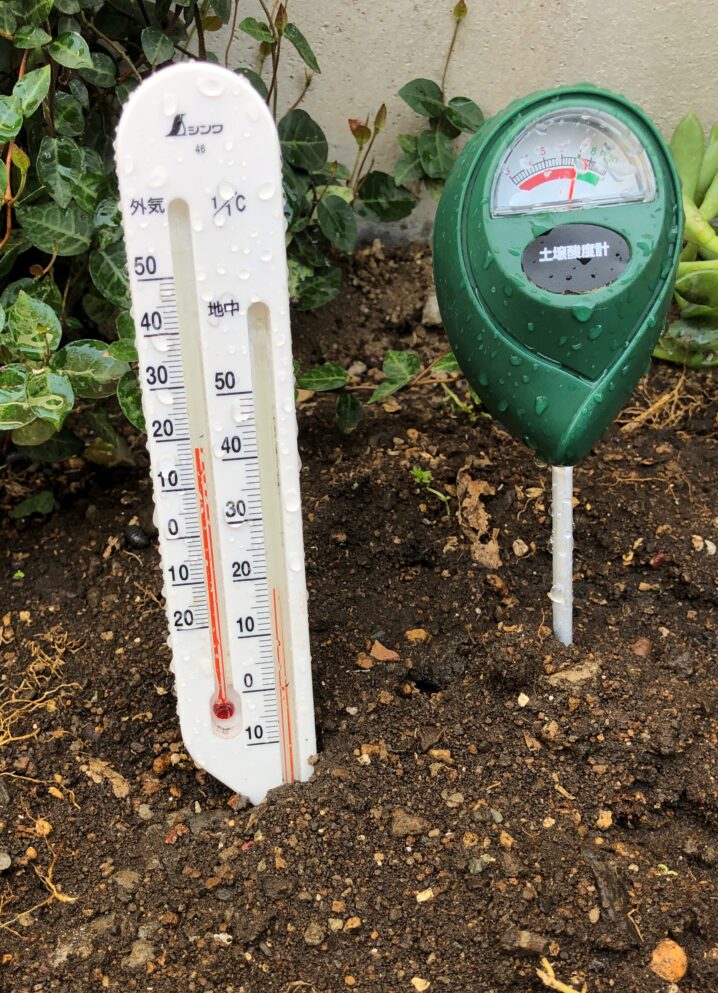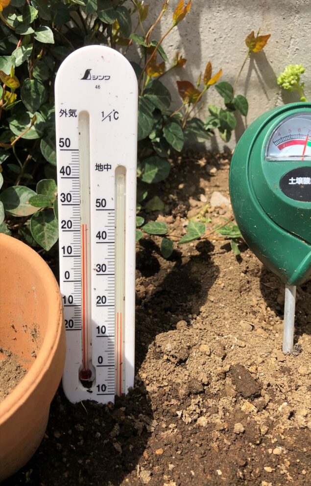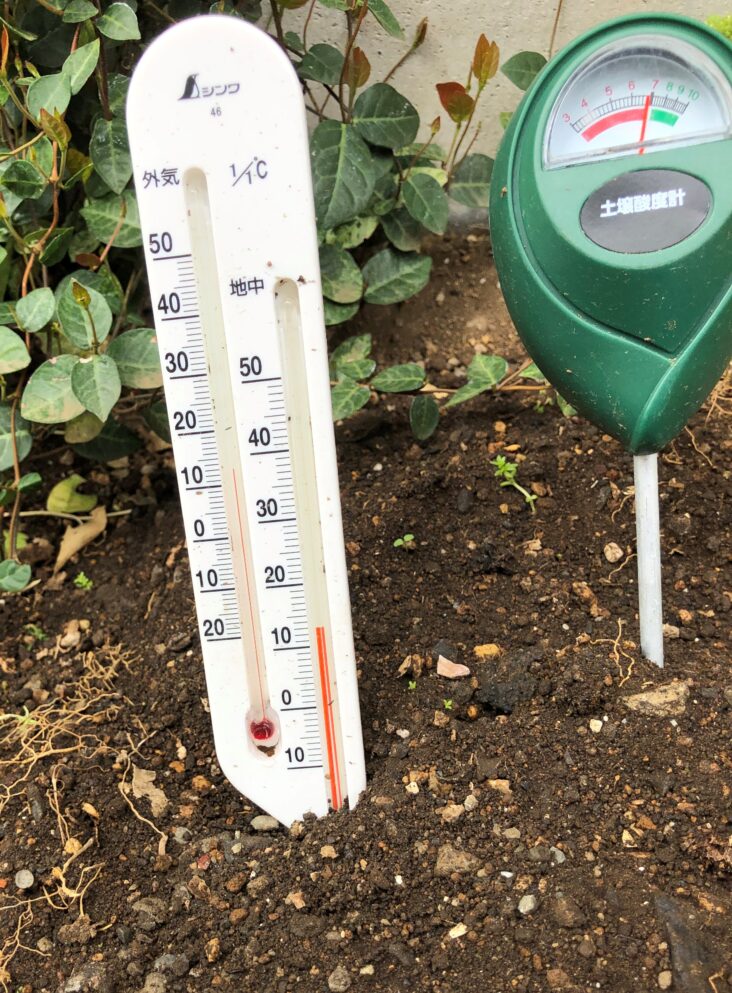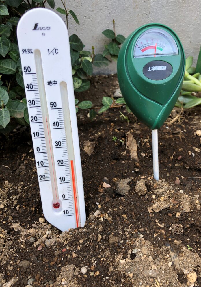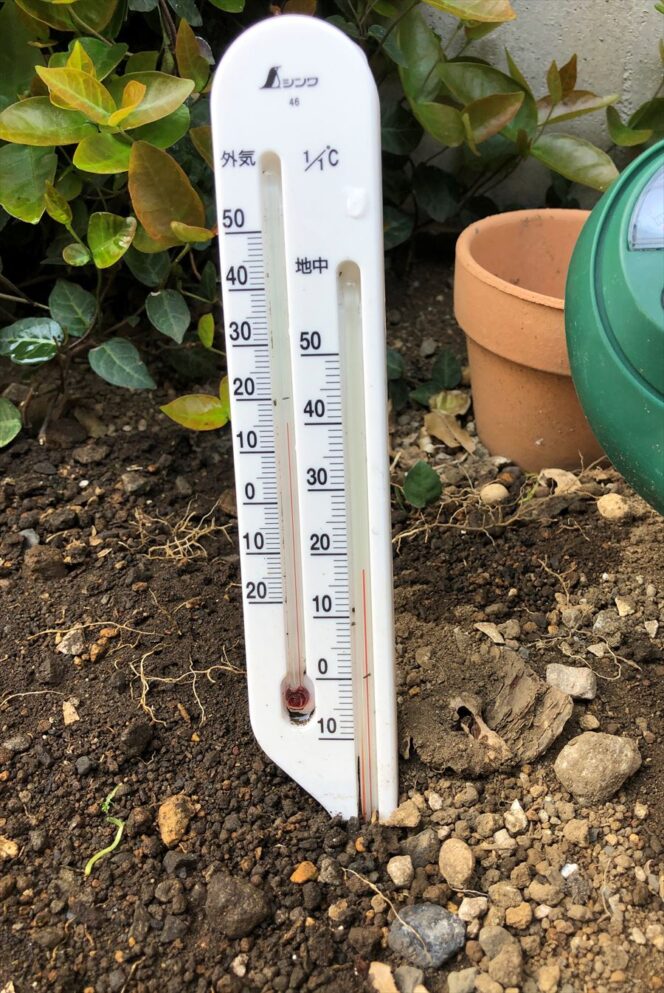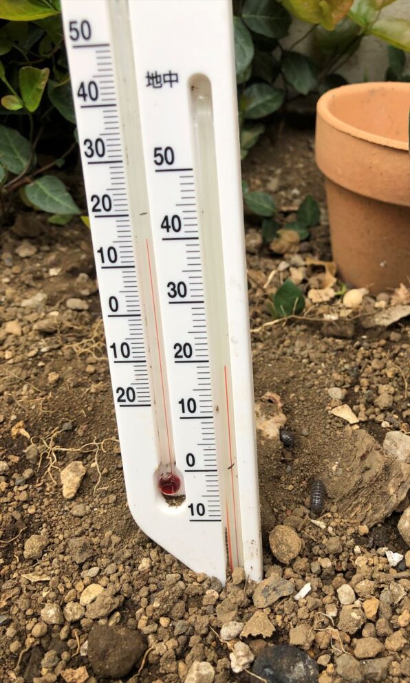 気温と地温を同時に図る温度計を用い、気温は地上約2cm、地温は地下約2cmの箇所を測定しました。