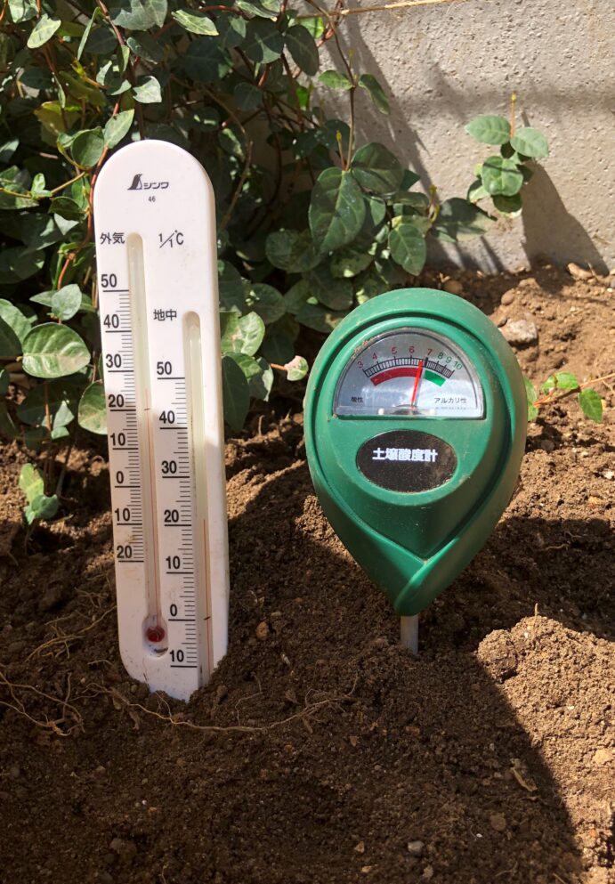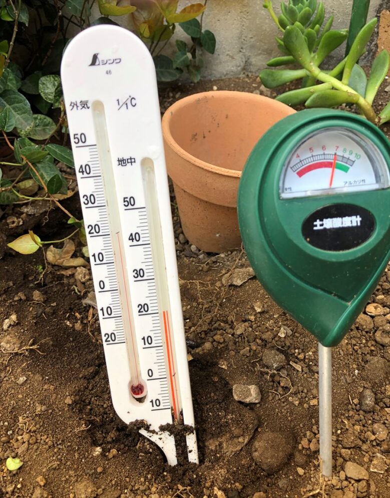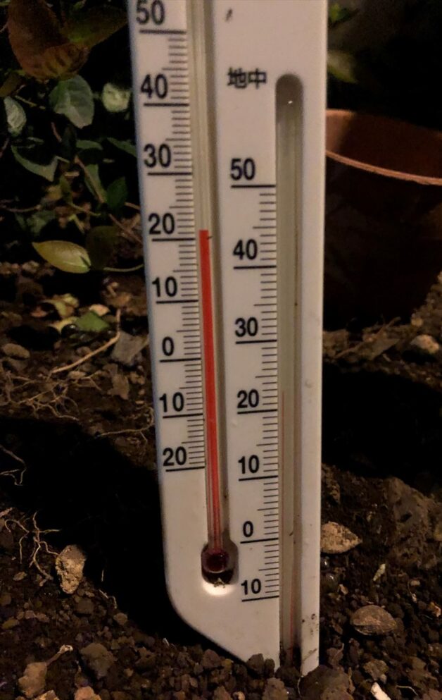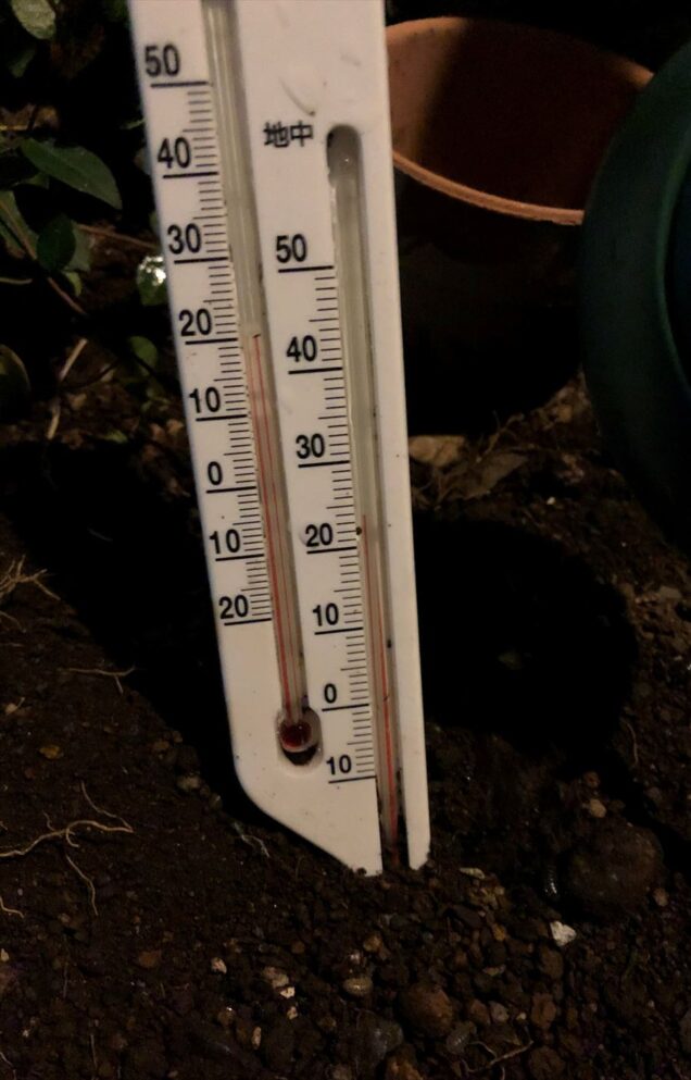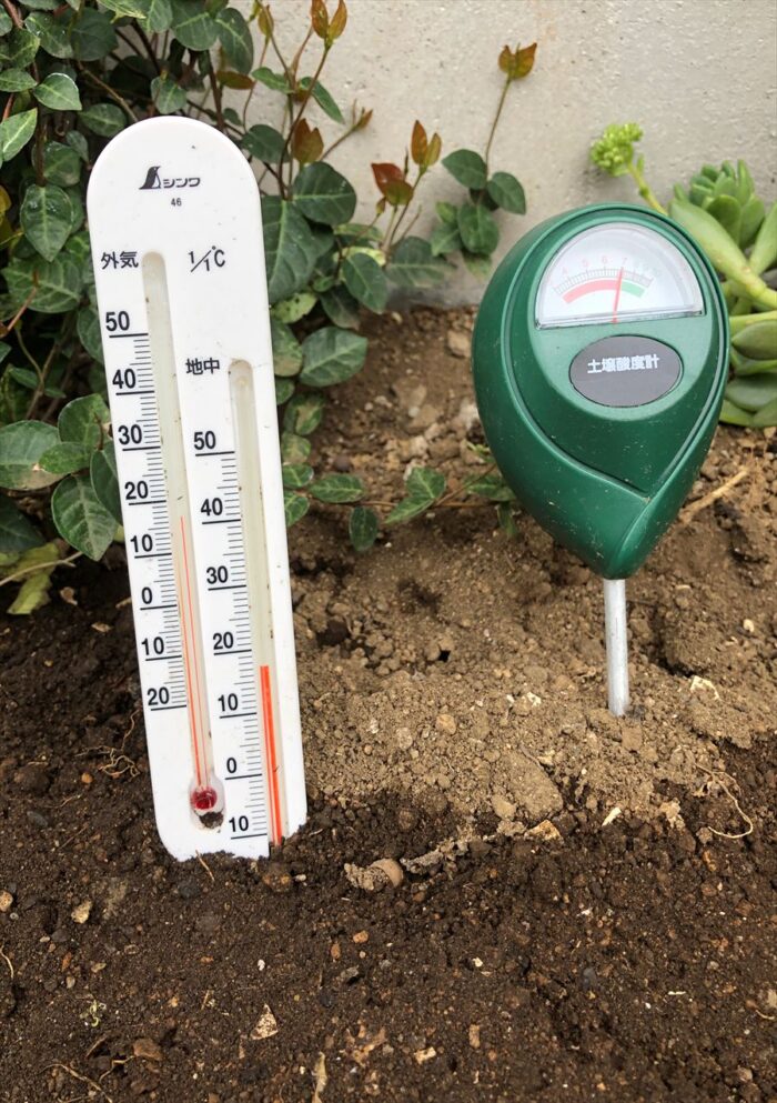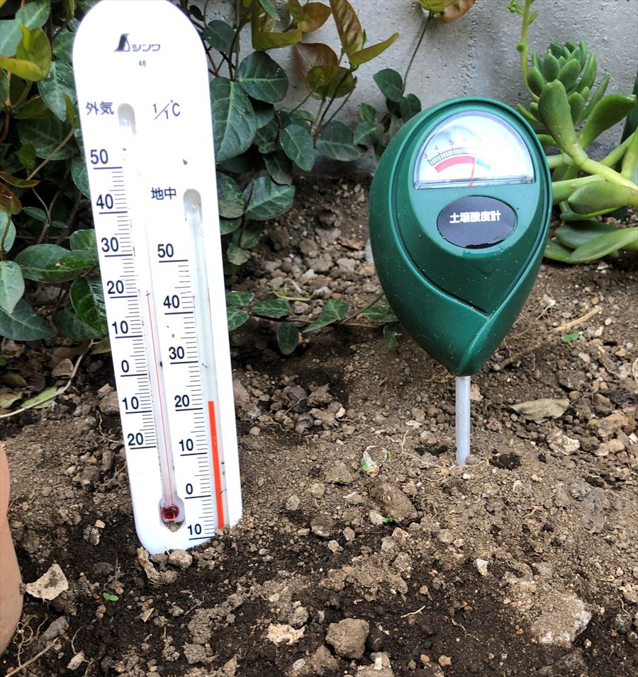 気温と地温を同時に図る温度計を用い、気温は地上約2cm、地温は地下約2cmの箇所を測定しました。