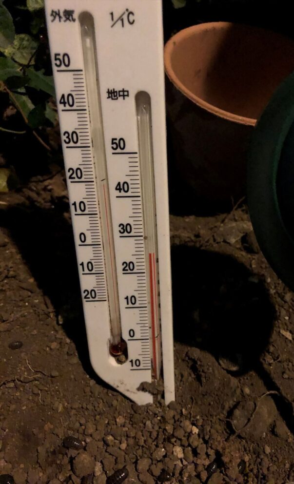 生ごみを埋めた直後は、気温と地温がほぼ一緒でしたが、掘り起こして酸素を供給した後、地温が気温より高くなりました。 更に米ぬかをまぶした後は、地温と気温の差が大きくなりました。 酸素や米ぬかの影響で微生物の働きが活発になり、生ゴミが早く分解され、その熱により地温が高くなると推定しています。