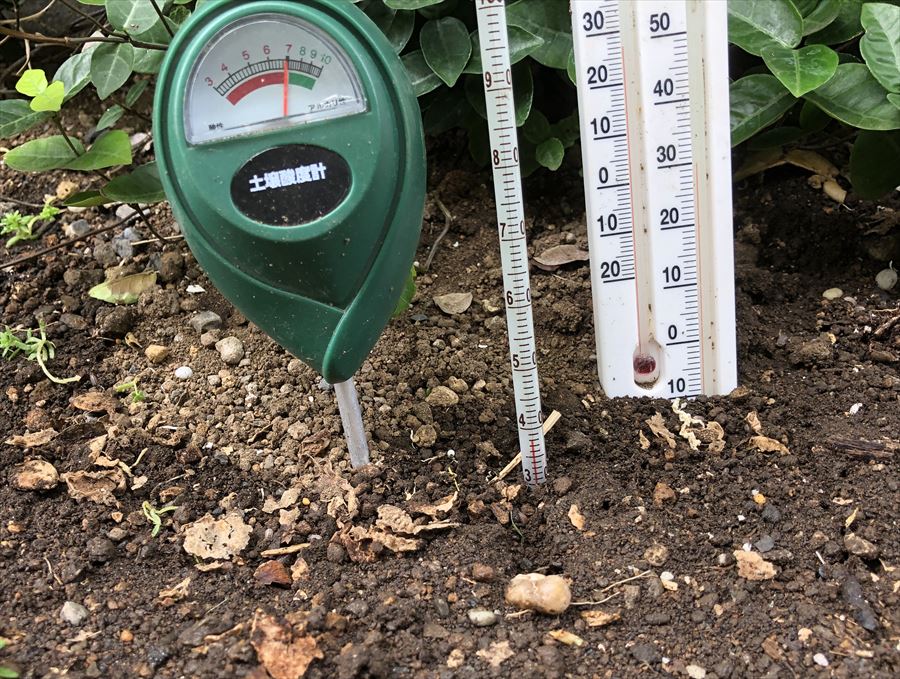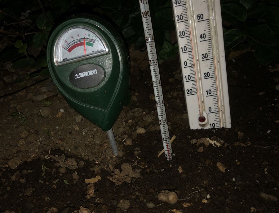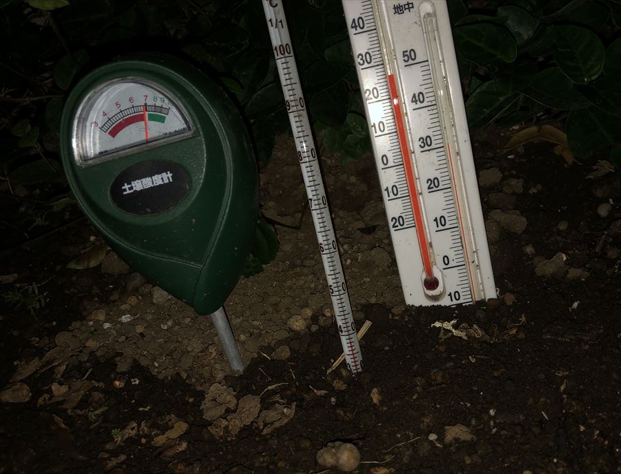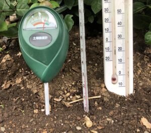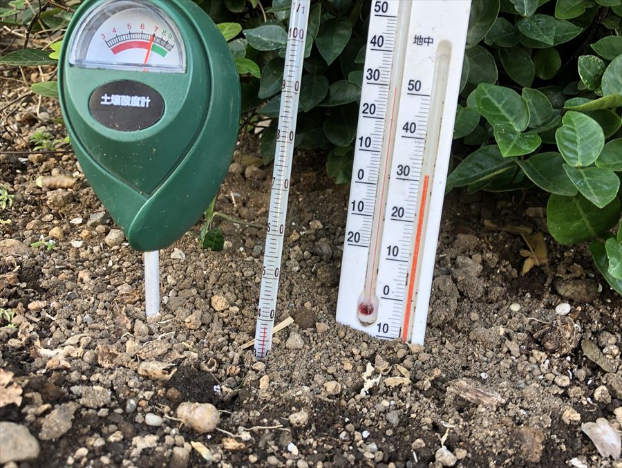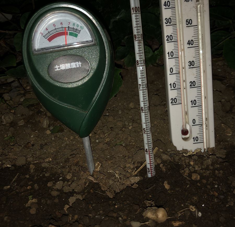 土壌酸度計、温度計を用い土の状態を観測しました。 地温の上昇から、微生物の活動(堆肥化)が埋めた直後から約10日間続いたことが確認できました。