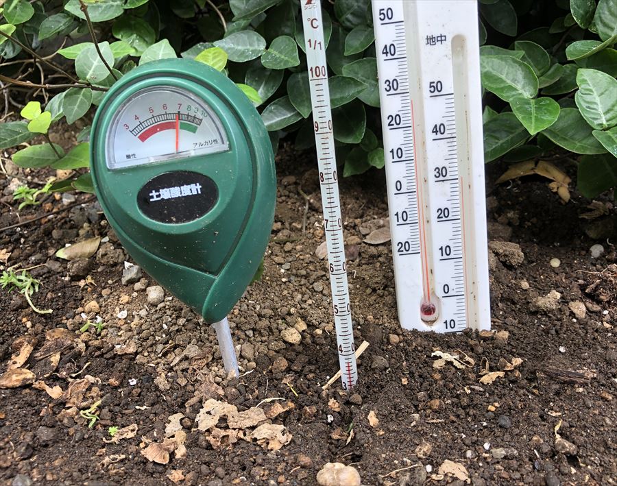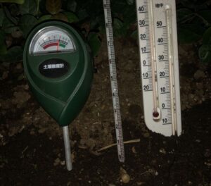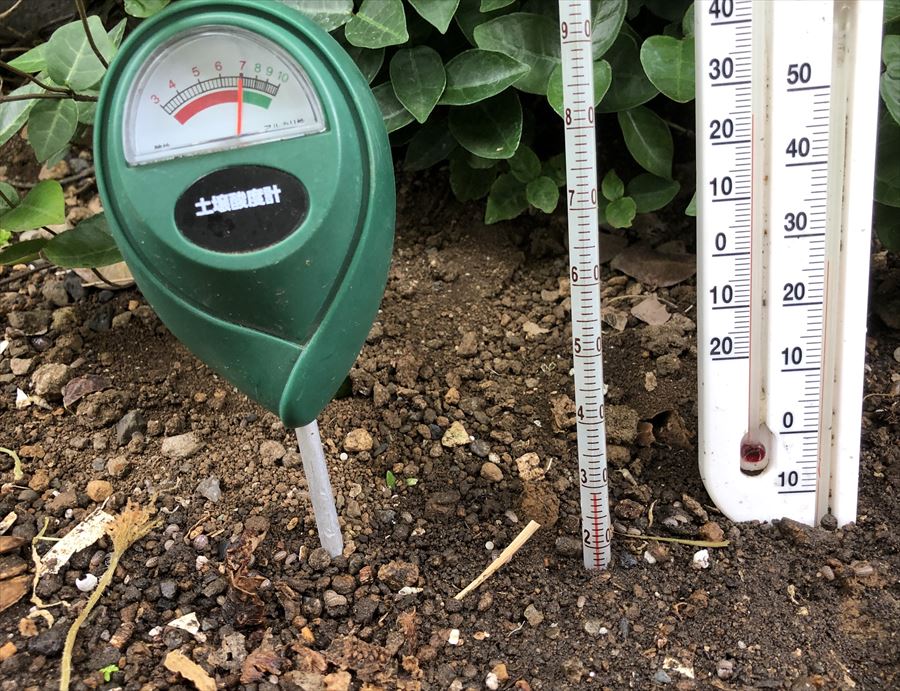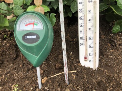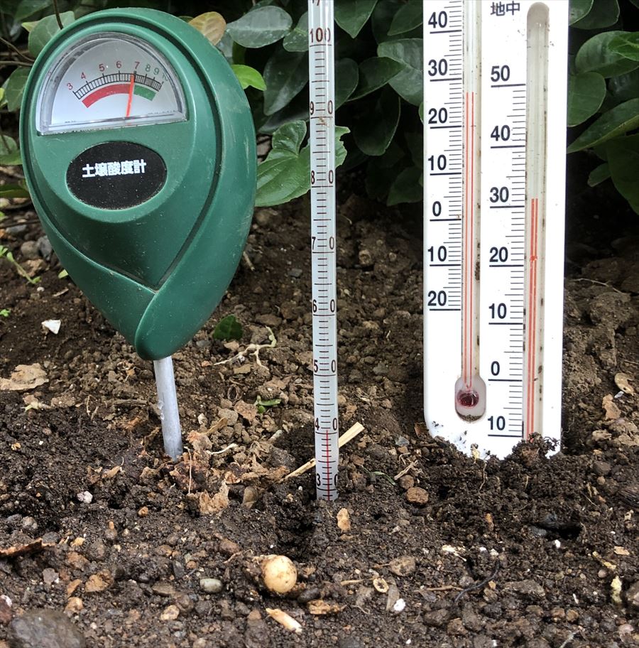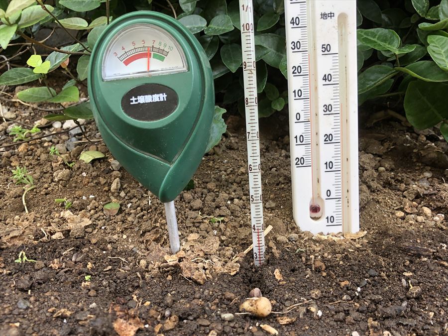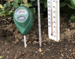 土壌酸度計、温度計を用い土の状態を観測しました。 地温の上昇から、微生物の活動(堆肥化)が埋めた直後から約10日間続いたことが確認できました。