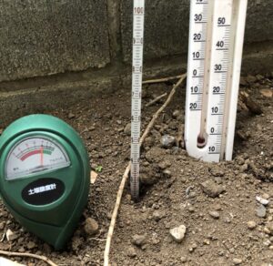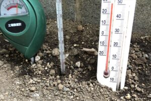キュウリ根元左右の埋めた場所で地温を測定すると、1週間後でも地下10cmで38℃でした。 微生物の働きが活発になり、数日間高温が続き、キュウリの根に障害を及ぼしたと推定できます。