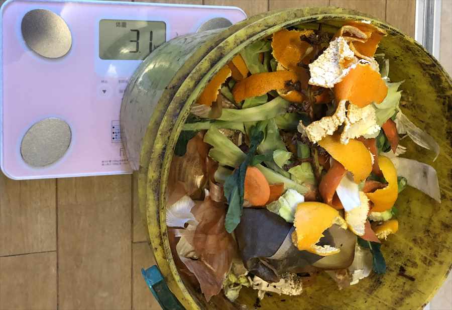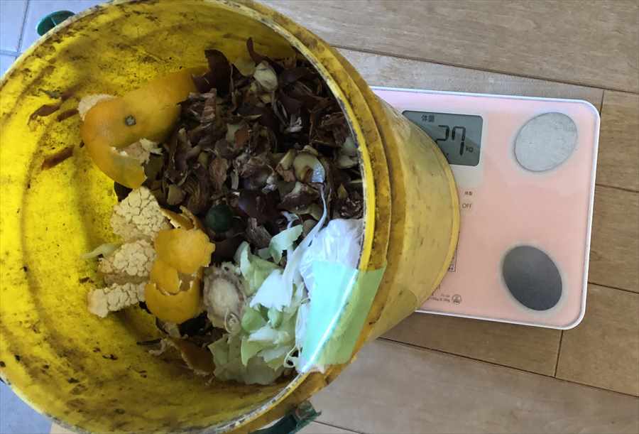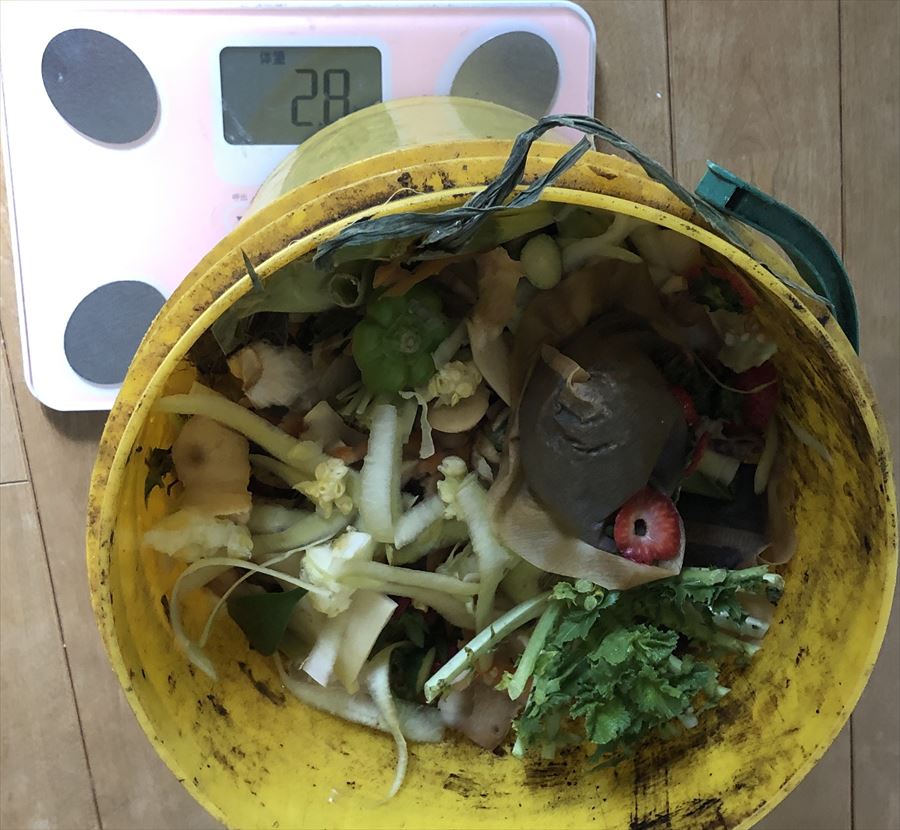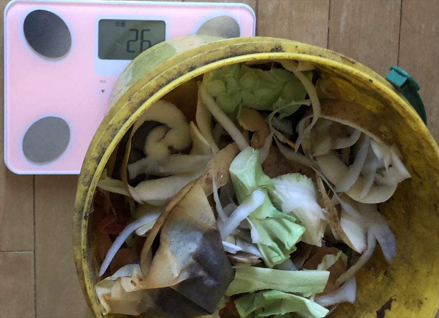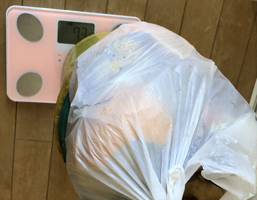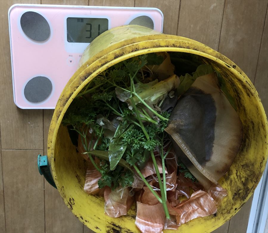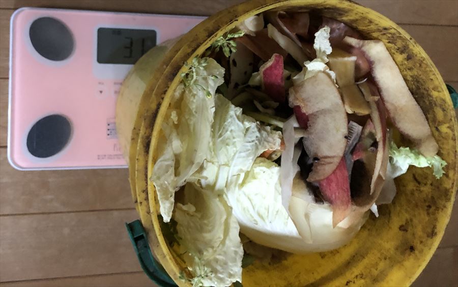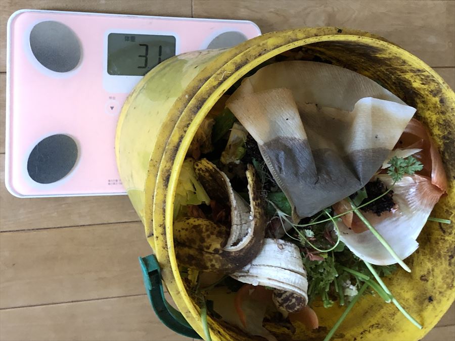 通常、キッチンで1週間溜めた生ごみを埋めています。 体重計で重量を計り、バケツ分の重量0.7kgを差し引いて生ごみ重量を算出しています。 生ゴミは、季節ごとに変わりますが、