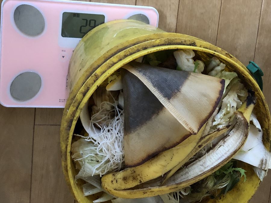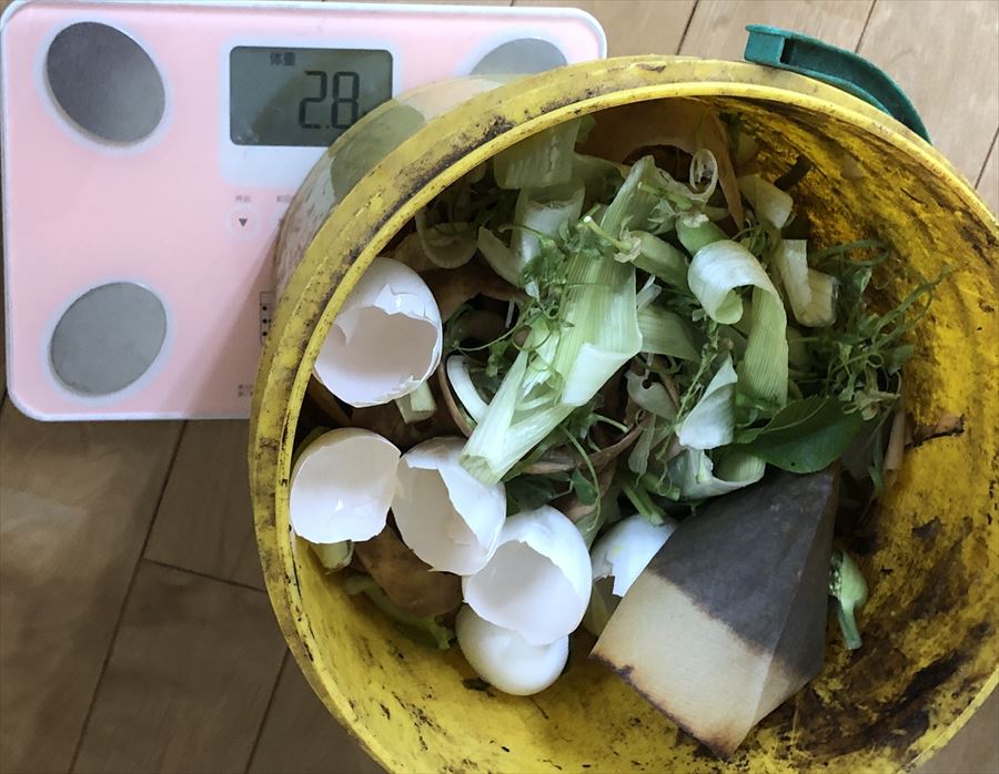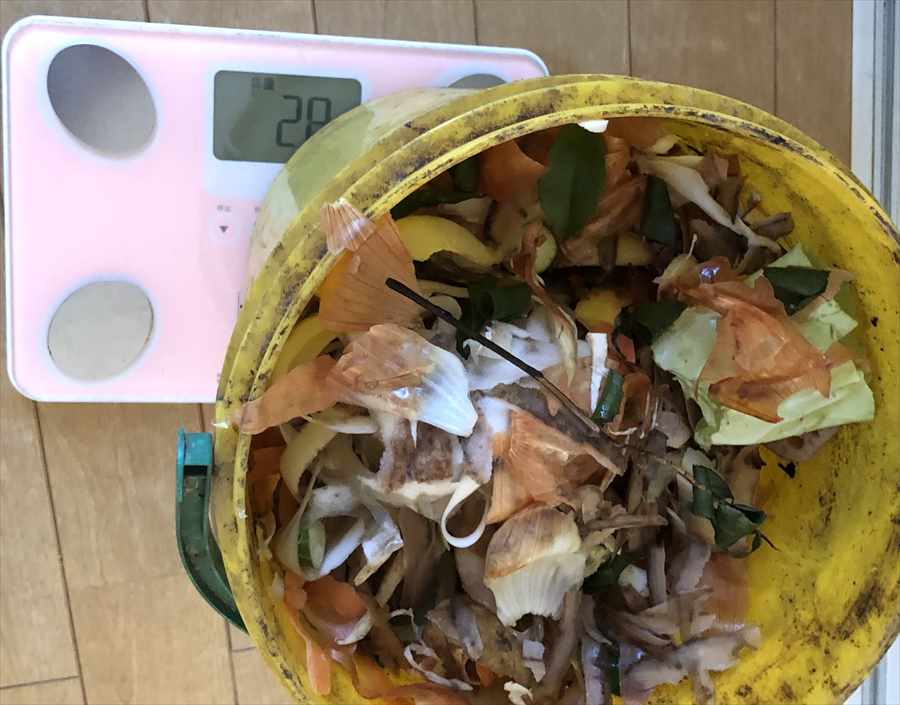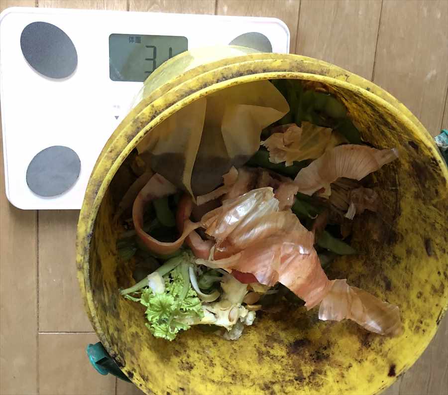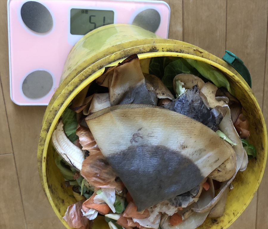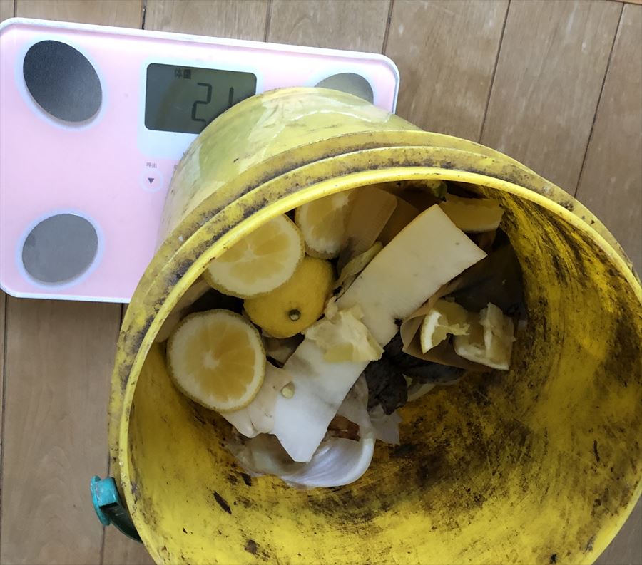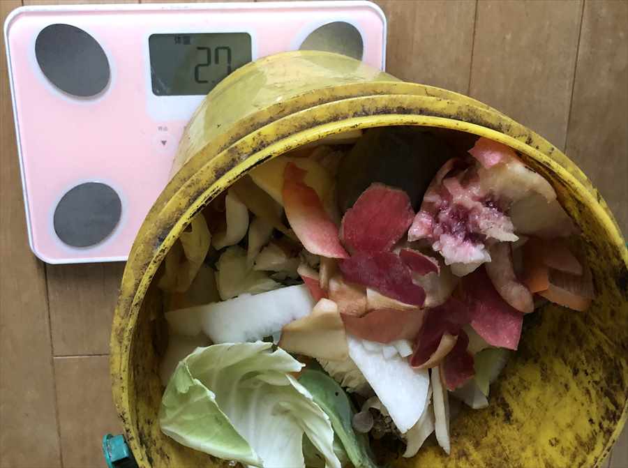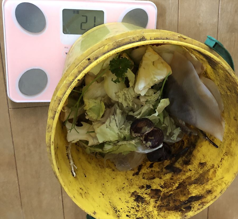通常、キッチンで1週間溜めた生ごみを埋めています。 体重計で重量を計り、バケツ分の重量0.7kgを差し引いて生ごみ重量を算出しています。 生ゴミは、季節ごとに変わりますが、