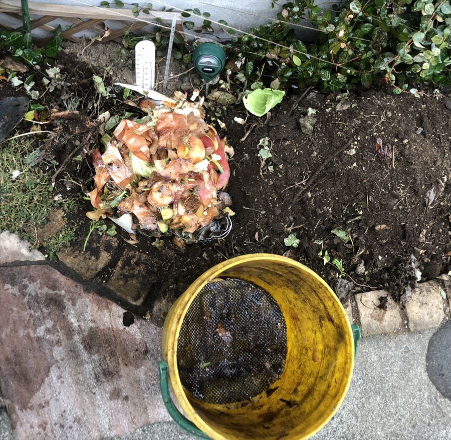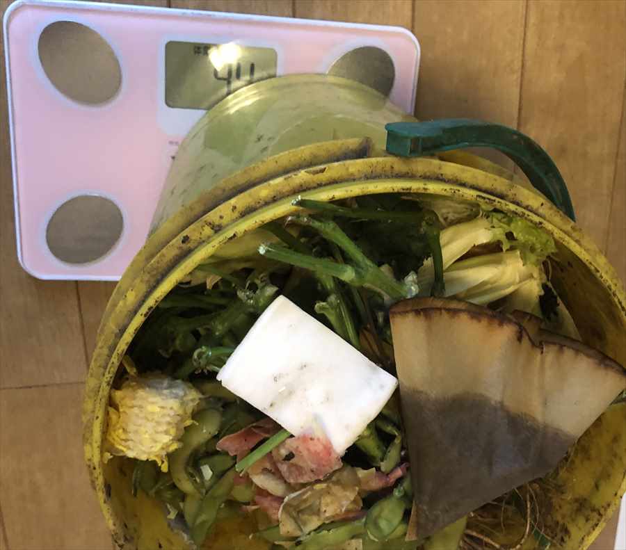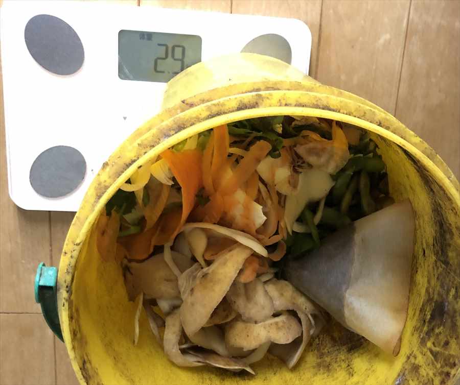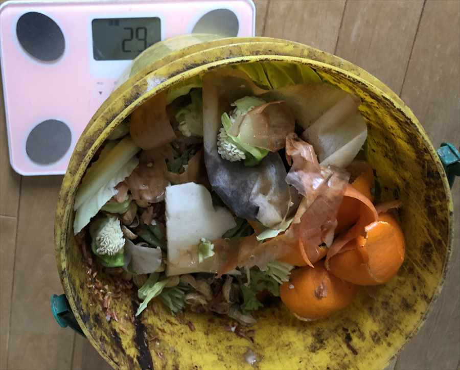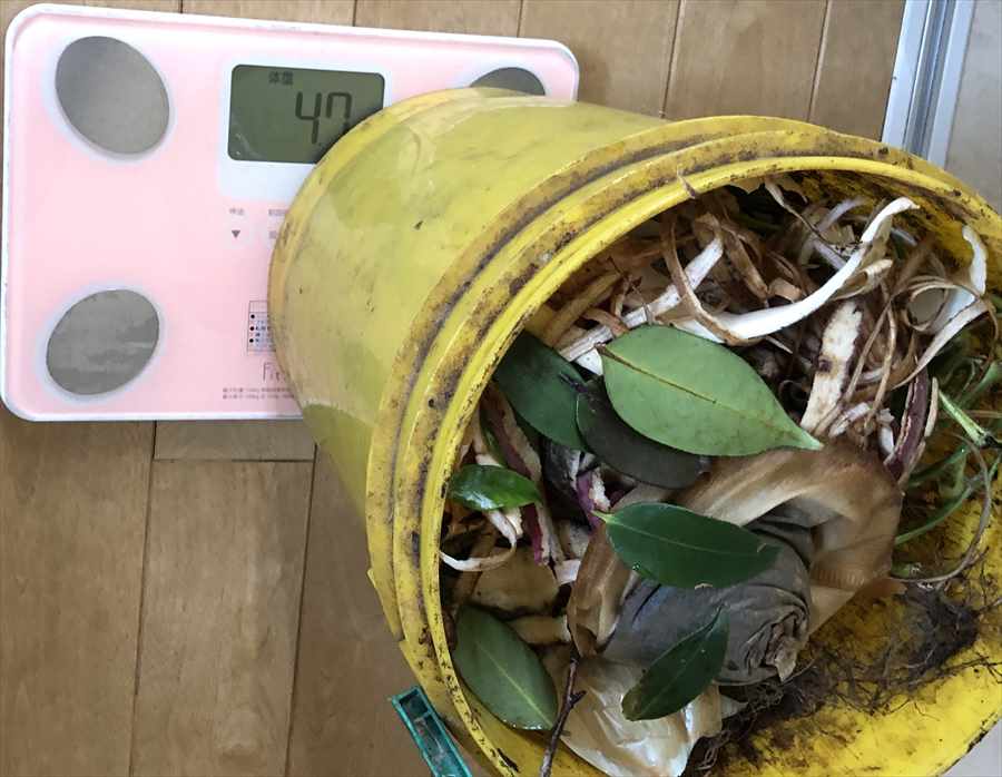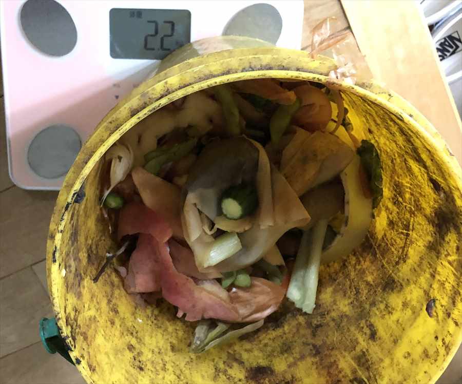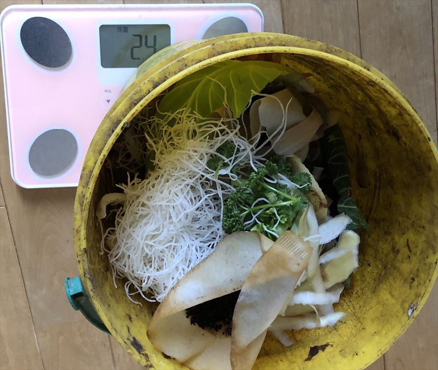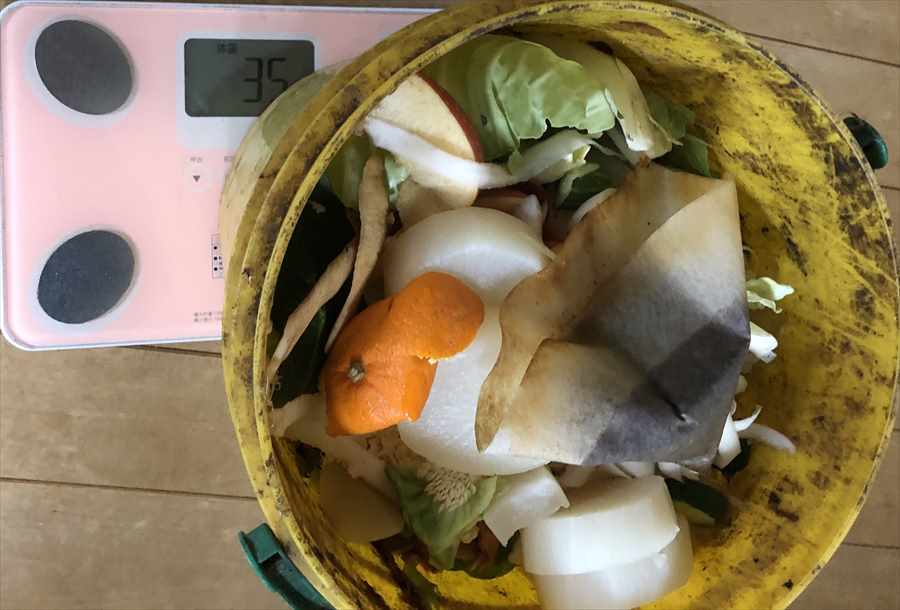 通常、キッチンで1週間溜めた生ごみを埋めています。 体重計で重量を計り、バケツ分の重量0.7kgを差し引いて生ごみ重量を算出しています。 生ゴミは、季節ごとに変わりますが、
