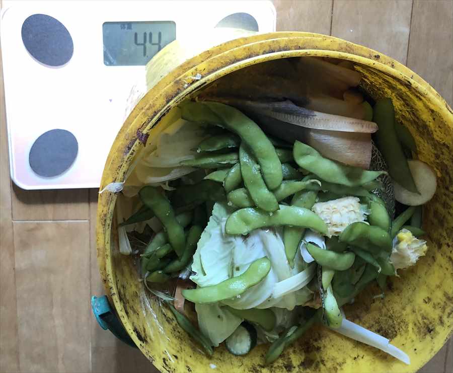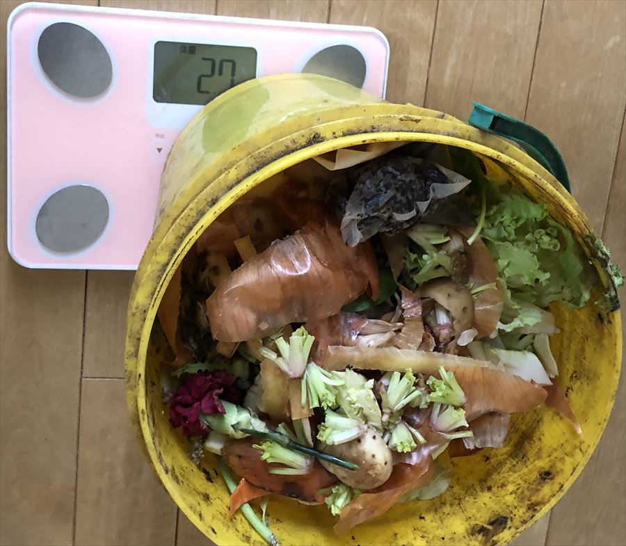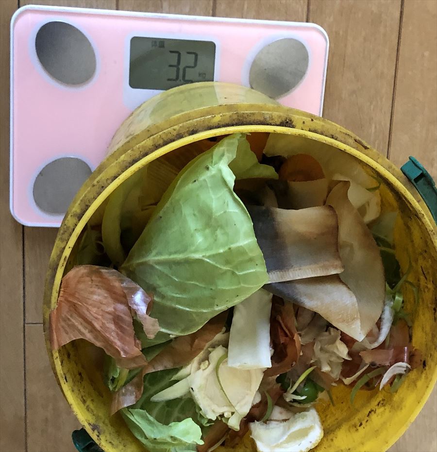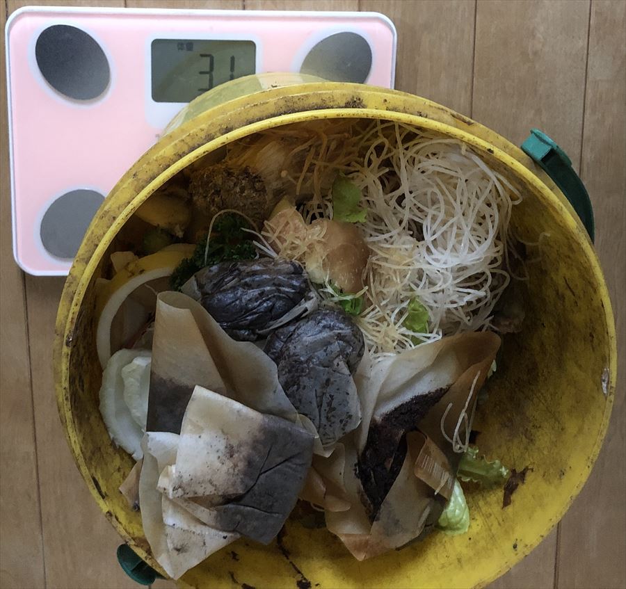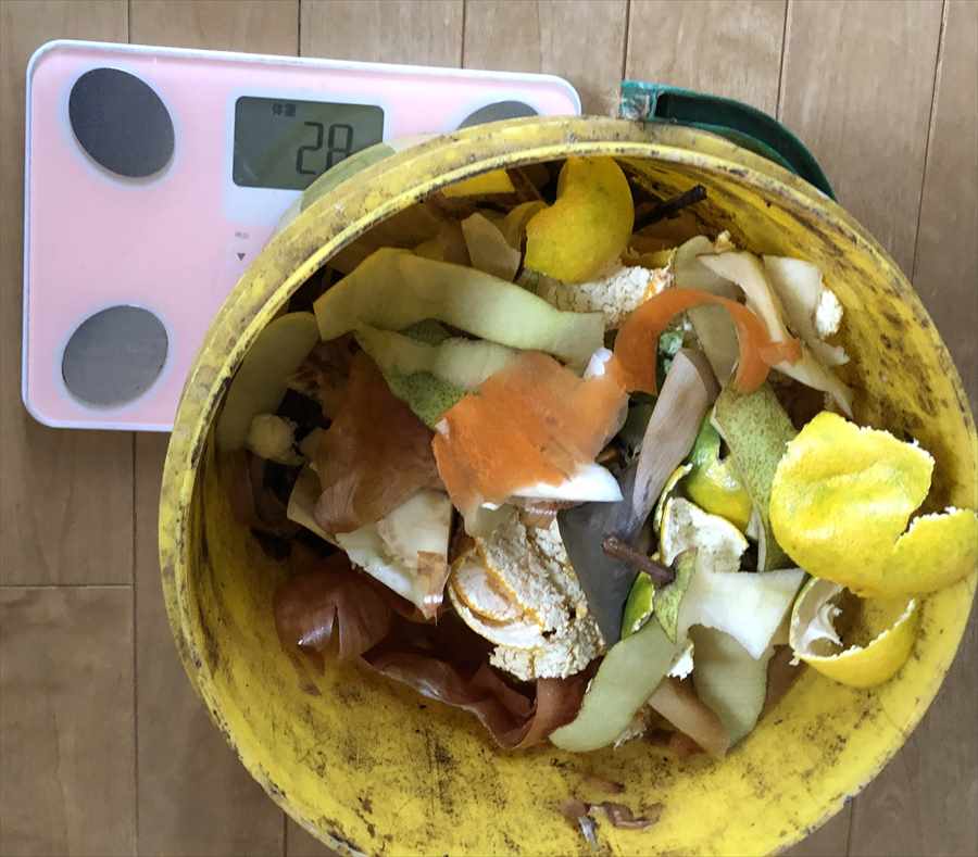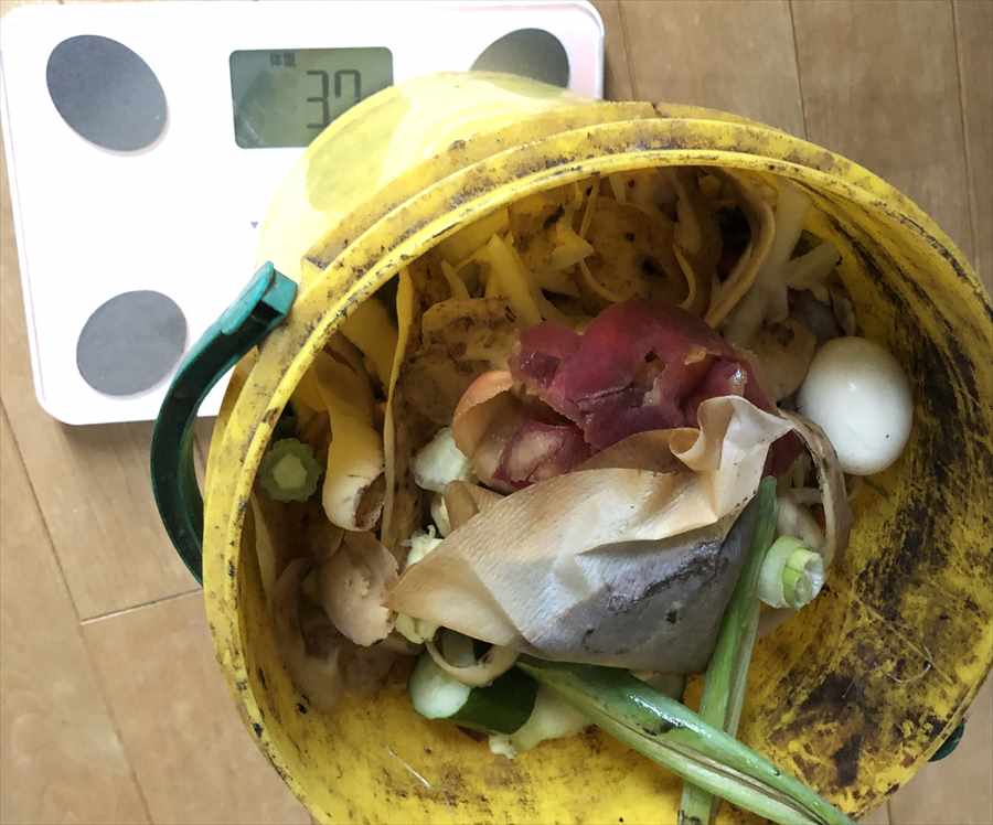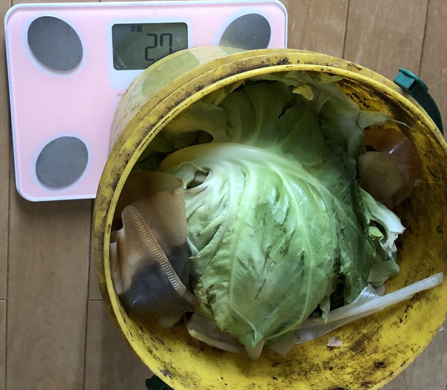 通常、キッチンで1週間溜めた生ごみを埋めています。 体重計で重量を計り、バケツ分の重量0.7kgを差し引いて生ごみ重量を算出しています。 生ゴミは、季節ごとに変わりますが、