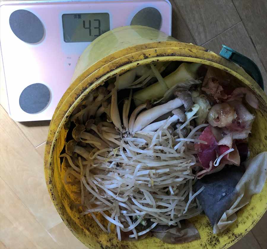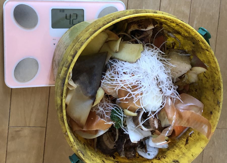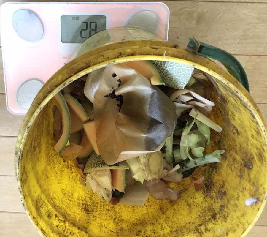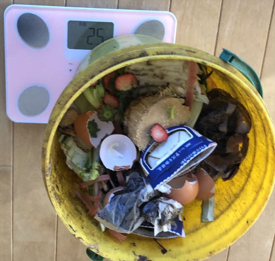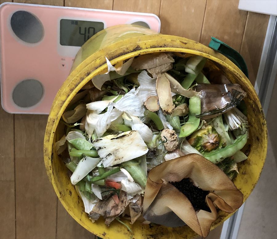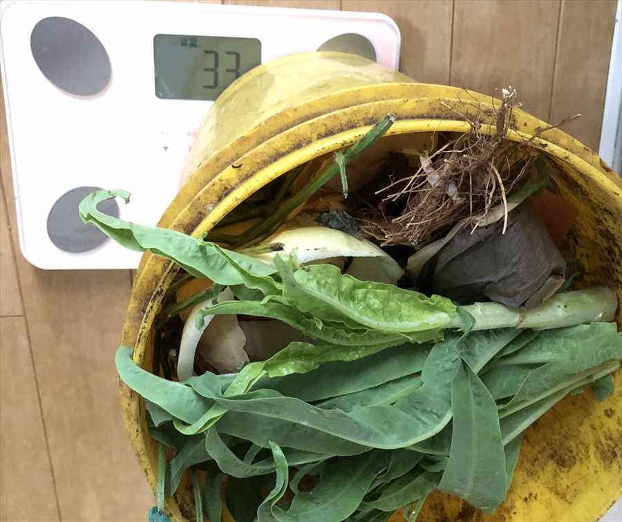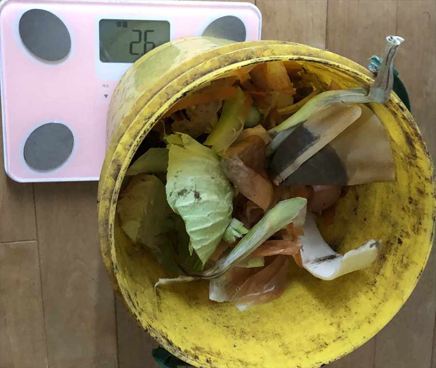 通常、キッチンで1週間溜めた生ごみを埋めています。 体重計で重量を計り、バケツ分の重量0.7kgを差し引いて生ごみ重量を算出しています。 生ゴミは、季節ごとに変わりますが、