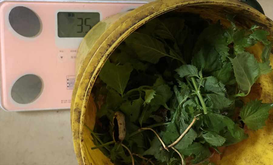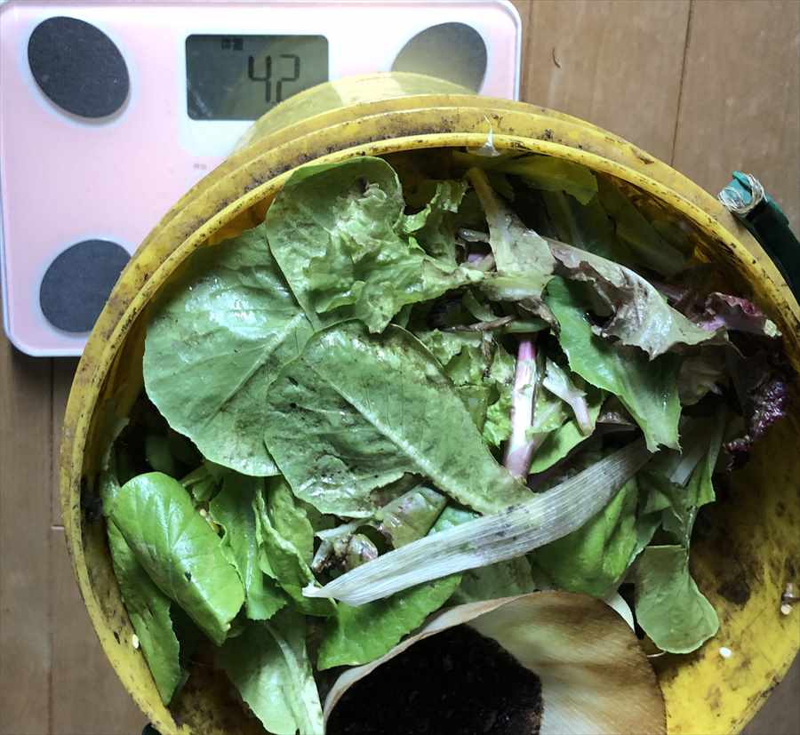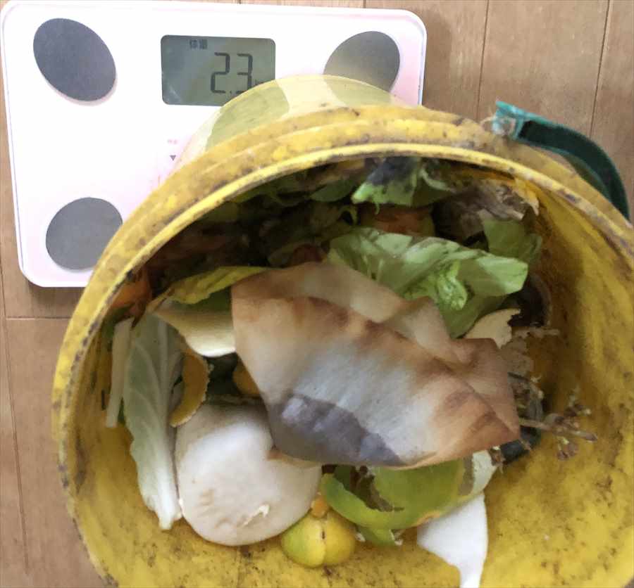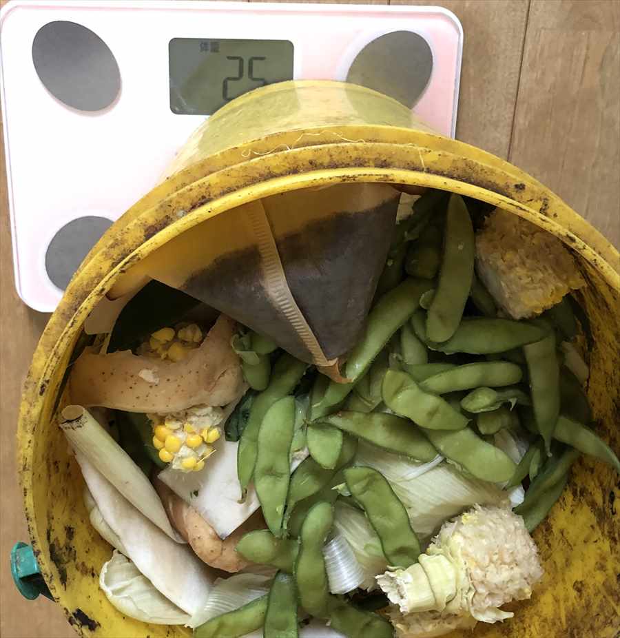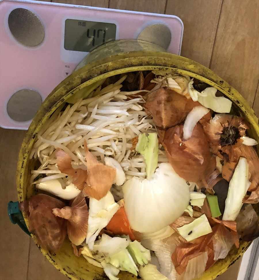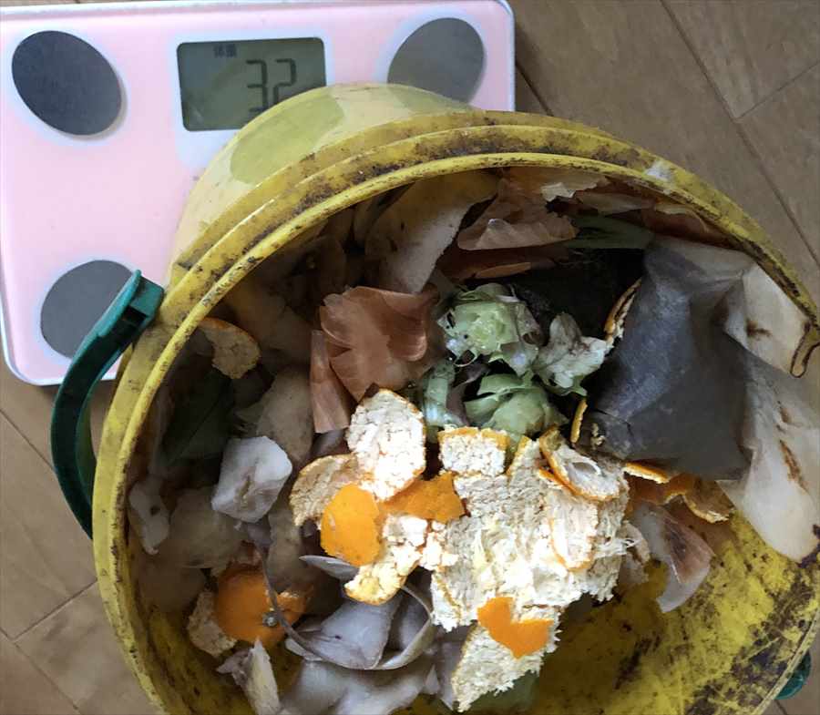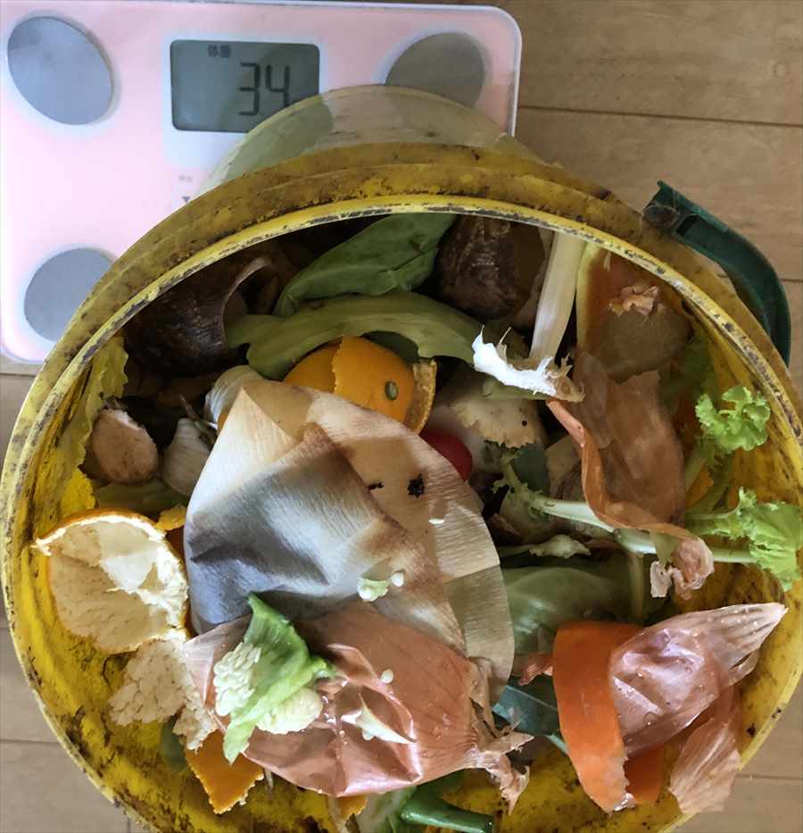 通常、キッチンで1週間溜めた生ごみを埋めています。 体重計で重量を計り、バケツ分の重量0.7kgを差し引いて生ごみ重量を算出しています。 生ゴミは、季節ごとに変わりますが、