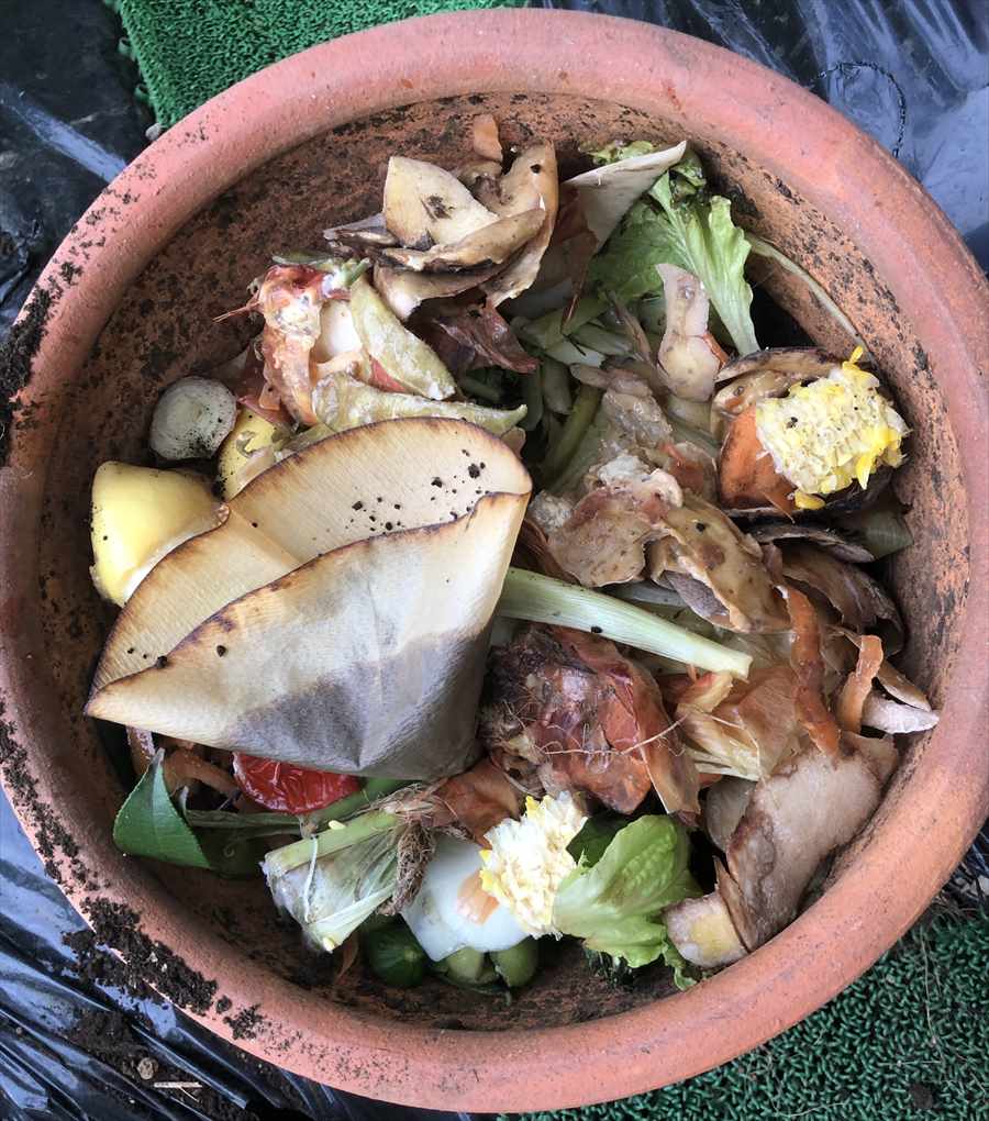 肉や魚の残飯は腐りやすく、異臭がして動物に掘り起こされる可能性があるので、入れていません。