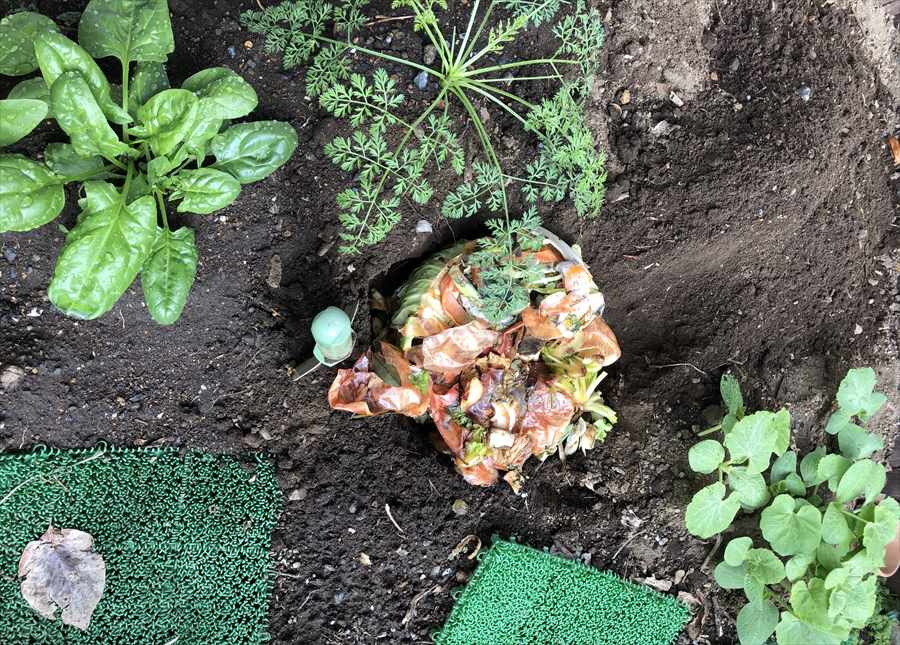 穴を掘ると、近くの野菜の根が側面に見える場合があります。 基本的に問題ありませんが、米ぬかを使うと熱とガスが発生するため、根を痛めて最悪枯れてしまいます。