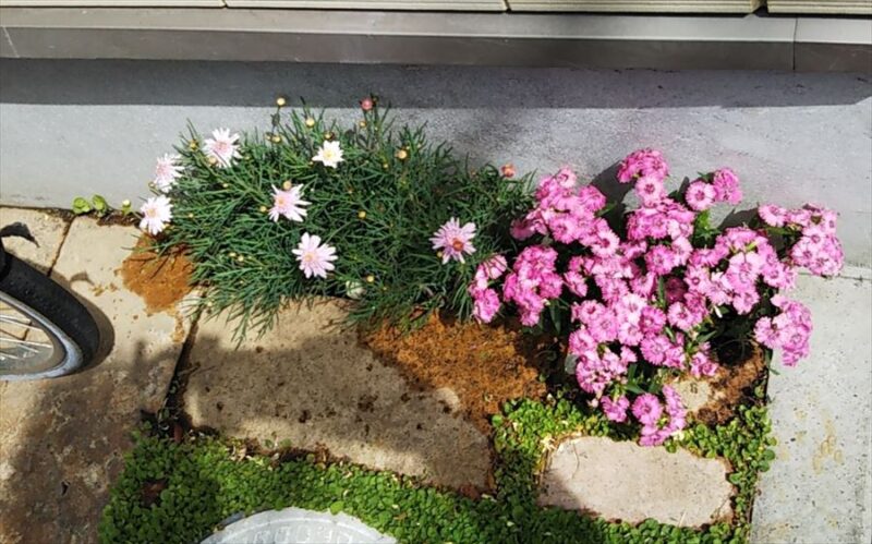 「駐輪場脇」ナデシコが枯れたので、畑のマーガレットを移植し、この箇所全面マーガレットにしました。