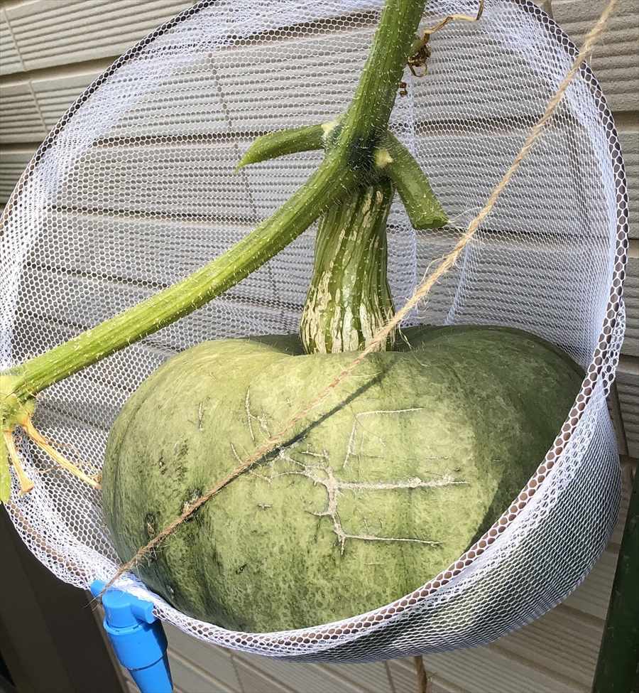 カボチャは、家の外壁に沿って蔓を伸ばしました。上から撮影すると一面葉が茂ってますが、横から撮影すると、麻紐に沿って空中に蔓が伸びています。 実が生った際も、空中で育つようにたもの網で支えました。